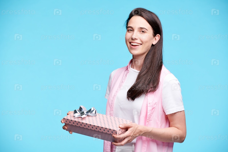 Молодая возбужденная брюнетка женщина в повседневной одежде держит упакованный подарочный ящик