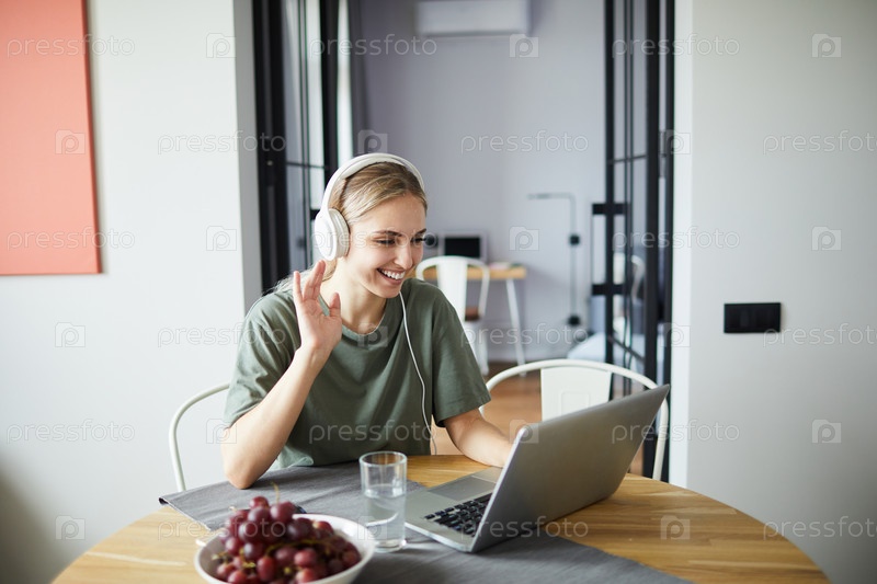 Веселая девушка в наушниках машет рукой другу во время видеочата