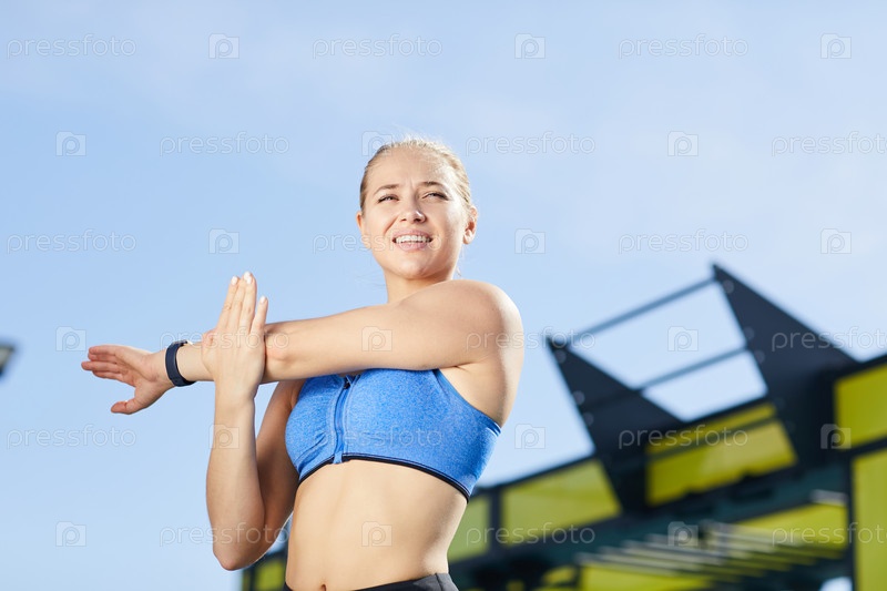 Веселая энергичная молодая женщина в спортивном бюстгальтере, стоящая на открытом грунте и растягивающая бицепсы после тренировки