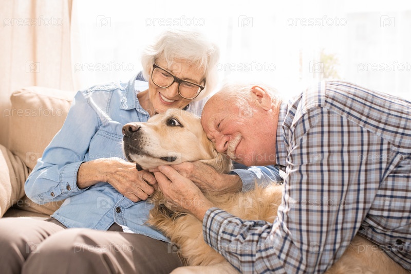 Старшая пара обнимает собаку Happy