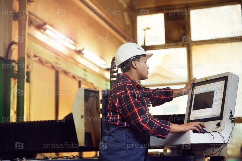 Портрет бокового вида женщины-работницы, работающей на машинах