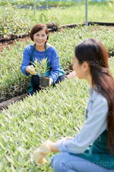 Работники теплиц сажают цветы