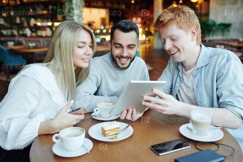 Веселый мужчина показывает своим друзьям любопытное видео на планшете, отдыхая в кафе