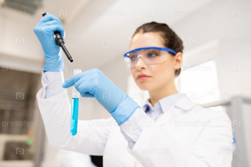 Женщина-химик сбрасывает реагент в пробирку
