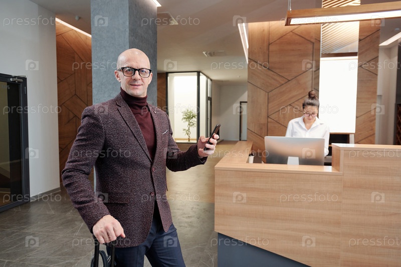 Элегантный лысый зрелый мужчина бизнес-путешественник с чемоданом и смартфоном