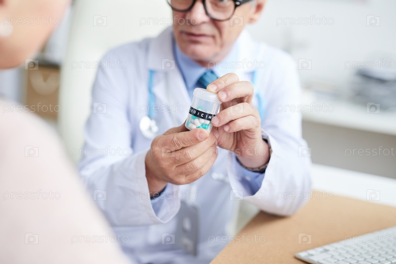 Близкий план врача-мужчины в лабораторном пальто, сидящего за столом и объясняющего график приема лекарств пациенту на встрече
