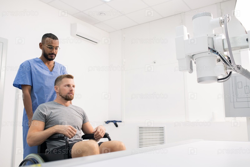 Молодой человек с больной ногой сидит на инвалидной коляске перед медицинским оборудованием