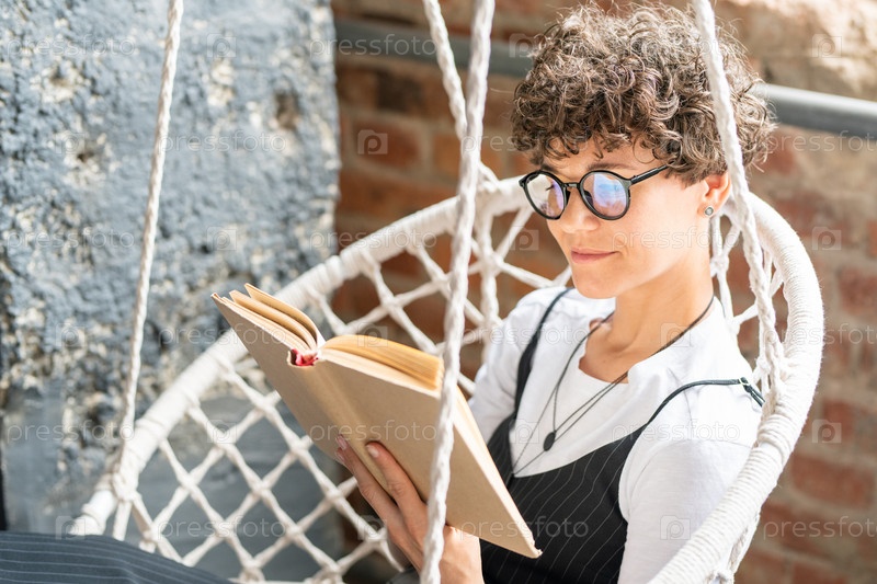 Красивая студентка в очках читает книгу дома