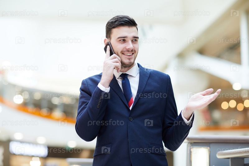 Веселый уверенный менеджер по аренде в стильном костюме стоит в вестибюле и жестикулирует рукой, разговаривая с клиентом по телефону