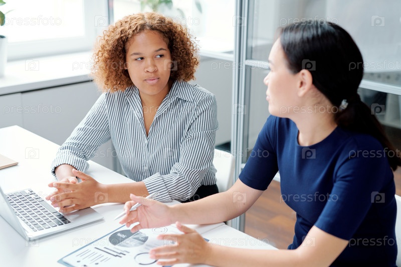 Молодая серьезная бухгалтерская работница смешанной расы смотрит на объяснение своего коллеги