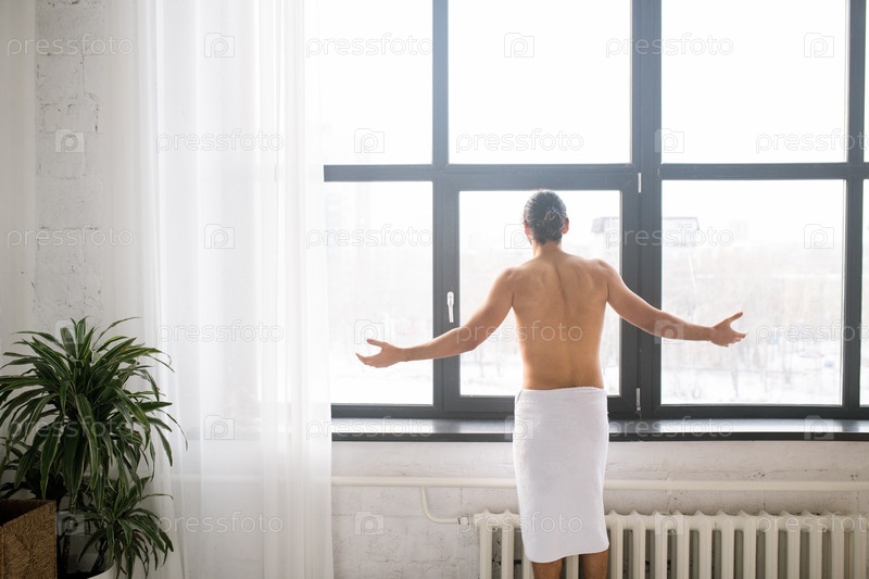 Задний вид парня с полотенцем на бедрах, который смотрит через окно после ванны