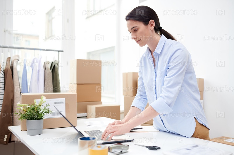 Серьезный молодой менеджер, концентрирующийся на работе над онлайн-заказами клиентов