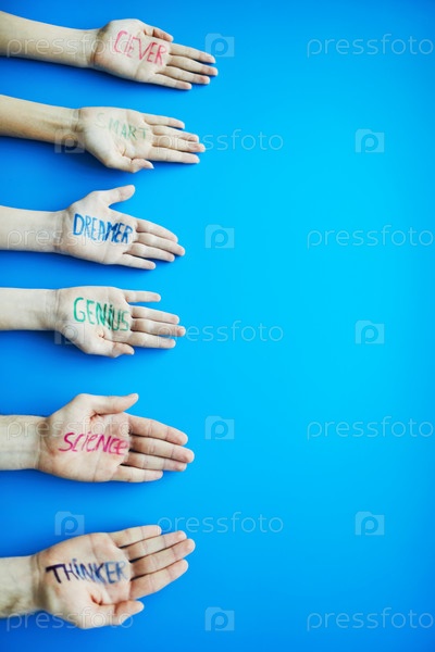 Характеристики, написанные на ладонях: высокоугольный вид людей, протягивающих руки с красочными надписями на синем фоне