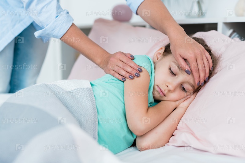 Больная маленькая девочка лежит в постели под одеялом, пока ее мать касается лба