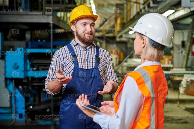 Молодой бородатый инженер в жесткой шляпе стоит на фабрике и жестикулирует руками, отчитываясь о производстве контента госпоже босс