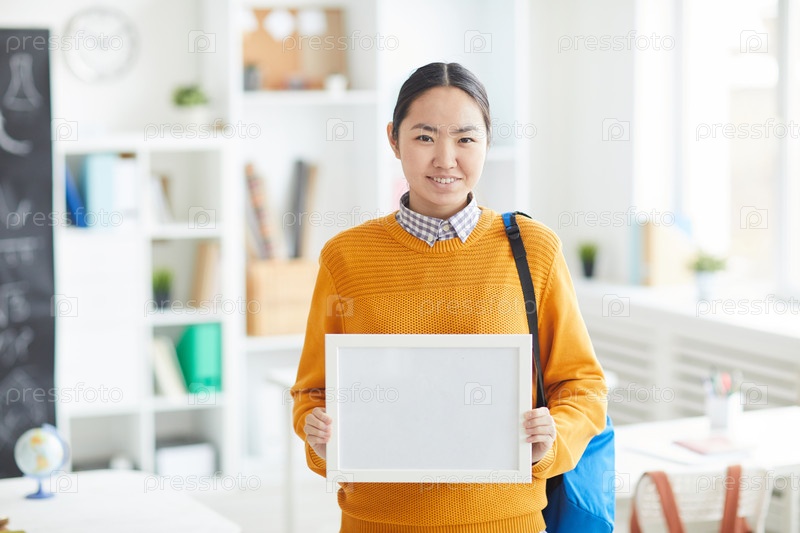 Счастливая привлекательная молодая азиатская студентка по обмену в ярком свитере стоит в пустом классе университета и держит баннер в раме