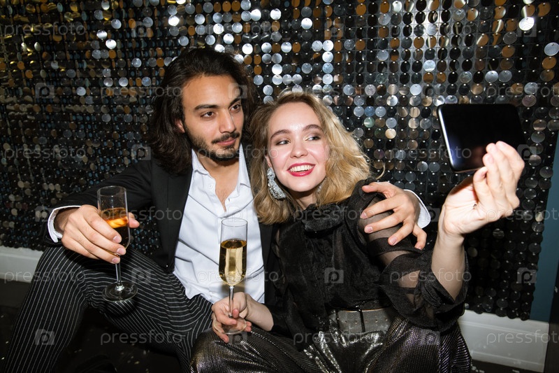 Молодая ласковая пара в гламурном наряде делает селфи по блестящей стене
