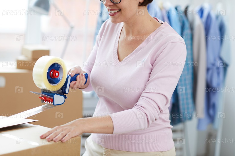 Молодой менеджер с упаковочной лентой пистолет распределитель уплотнение одного из ящиков