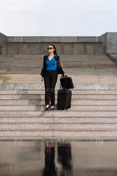 Бизнес-леди с чемоданом на ступеньках