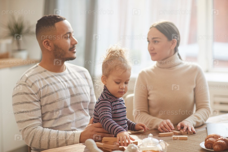 Счастливая семья играет с маленькой дочерью на кухне