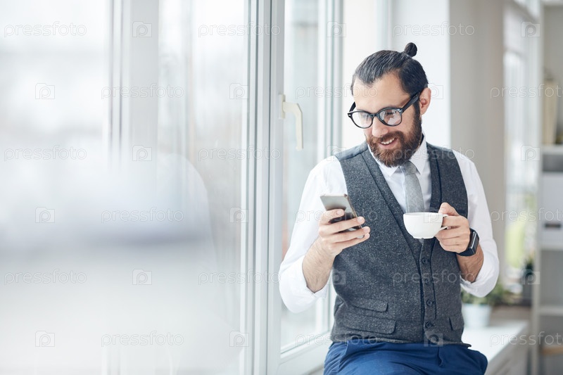 Улыбающийся хипстер молодой предприниматель в очках сидит на подоконнике и серфирует по сети со смартфоном, выпивая кофе