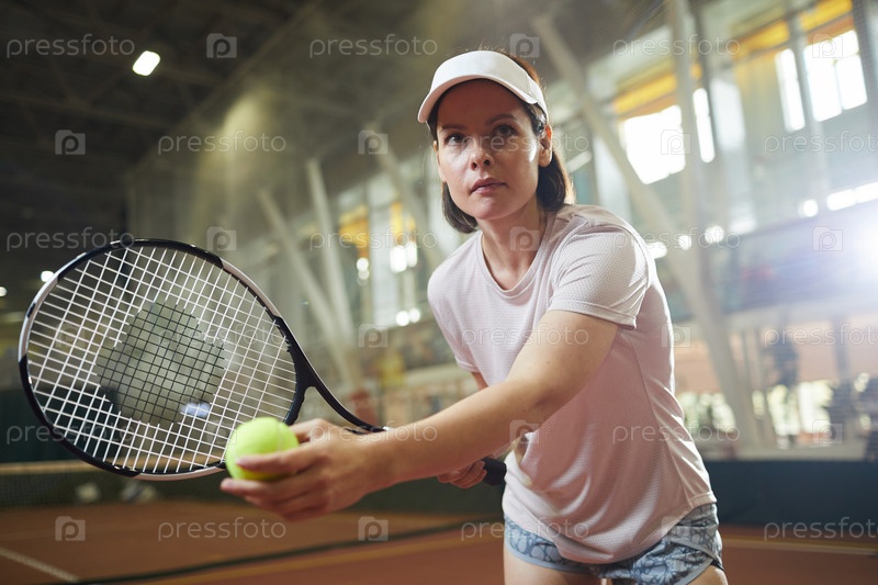 Серьезная, сосредоточенная женщина средних лет в шляпе стоит на крытом теннисном корте и подает мяч во время свободного времени
