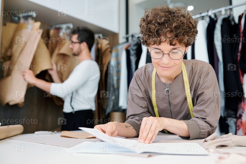 Молодая швейщица или модельер смотрит на эскиз новой модели