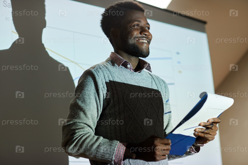 Улыбающийся успешный чернокожий студент с бородой стоит на проекционном экране в университетской комнате и читает отчет перед аудиторией