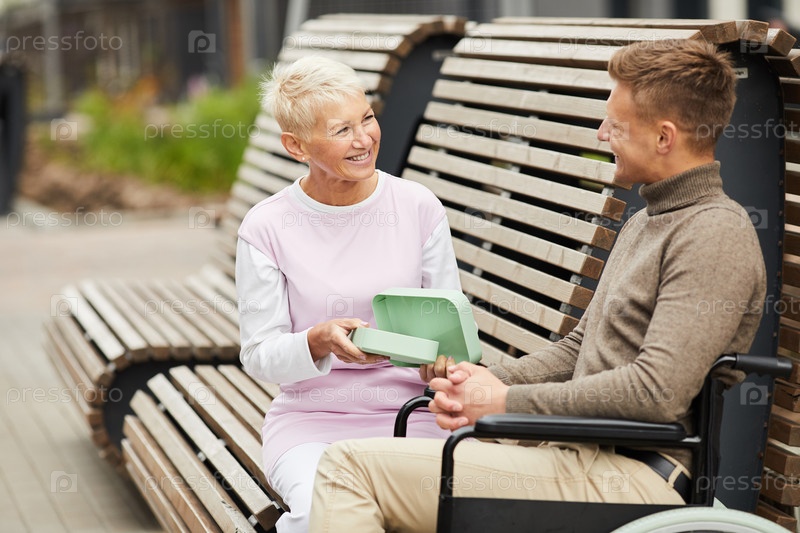 Веселая привлекательная зрелая леди с короткими волосами сидит на скамейке снаружи и открывает lunchbox для инвалида в инвалидном кресле
