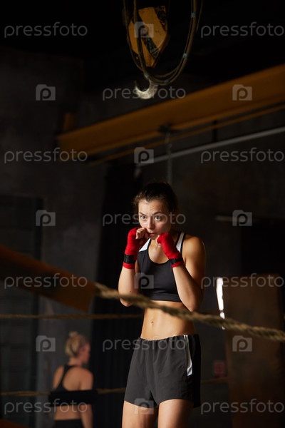 Жесткая молодая женщина, боксирующая на ринге