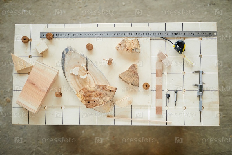 Стол плотника с инструментами и деревянными изделиями