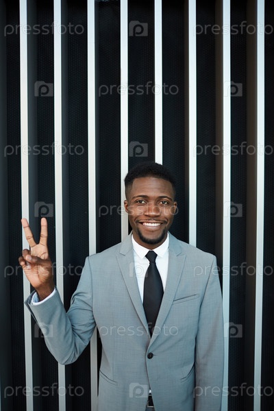 Веселый чернокожий бизнесмен, показывающий знак V