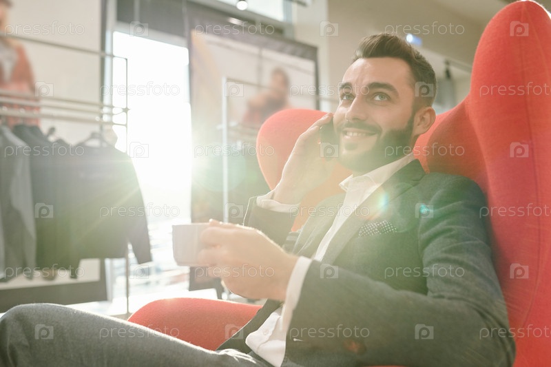 Молодой успешный бизнесмен с чашкой чая консультирует клиента по мобильному телефону