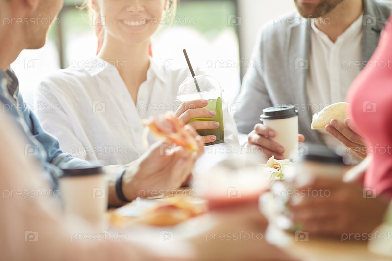 Близкий план улыбающихся молодых друзей в повседневных нарядах, сидящих за столом и пьющих безалкогольные напитки и едят нездоровую пищу