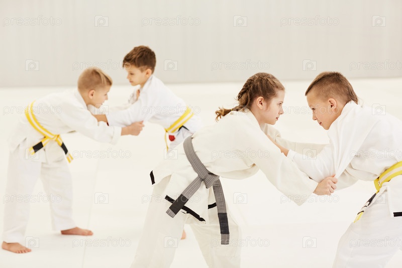 Дети тренируются во время урока каратэ