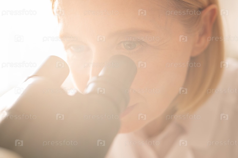 Зрелая леди использует микроскоп