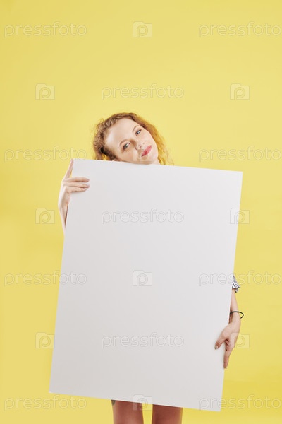 Размышляющая позитивная женщина с бумажным плакатом