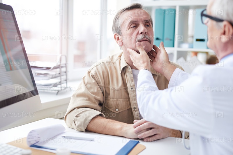 Вид на плечо старшего врача, сидящего за столом и прикасающегося к шее зрелого мужчины во время обследования шийного выделения