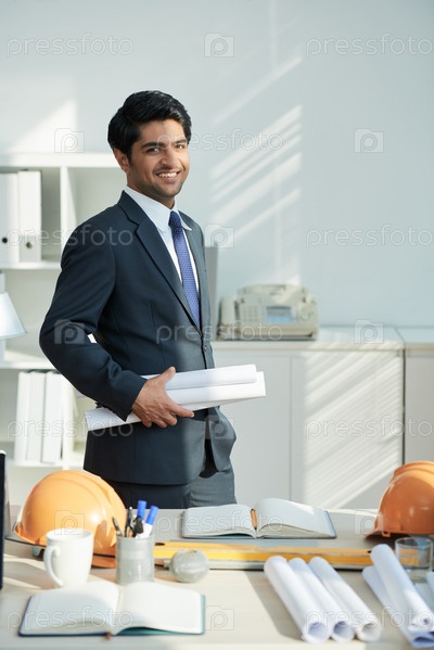 Успешный архитектор, работающий с чертежами