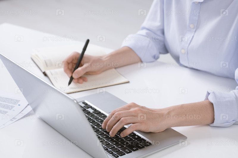 Рука молодой бизнес-жены, нажимающей клавиши клавиатуры ноутбука во время записи