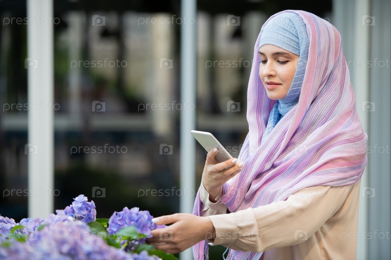 Молодая арабская женщина в хиджабе фотографирует красивую голубую гортензию