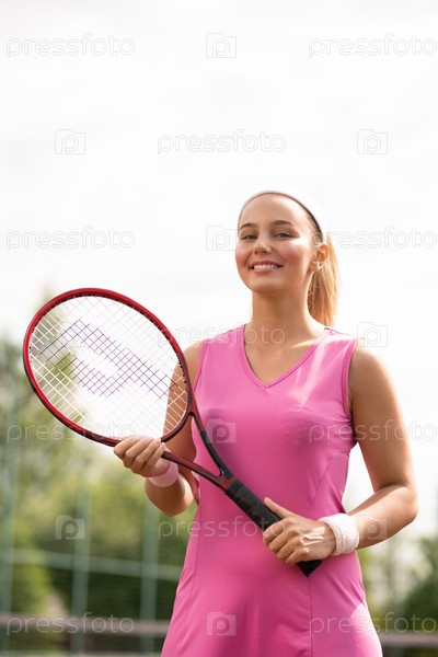 Веселая молодая блондинка, теннисистка с ракетой