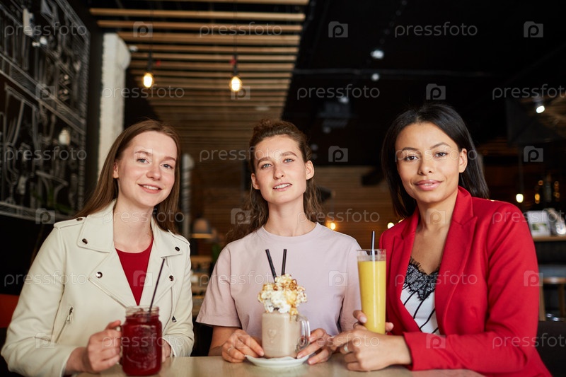 Красивые женщины наслаждаются сладкими напитками в кафе