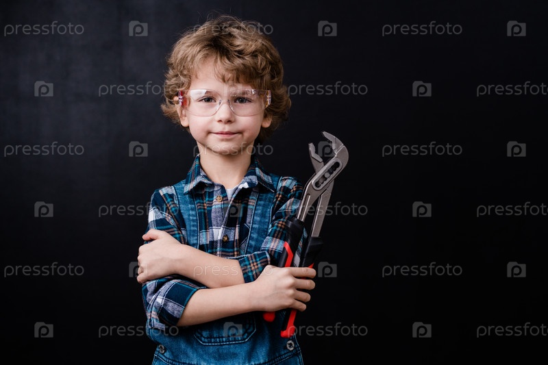Милый мальчик в рабочей одежде и защитных очках, держащий инструмент