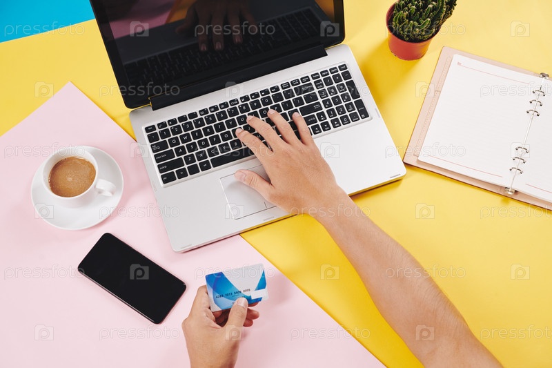 Мужчина покупает онлайн с помощью кредитной карты