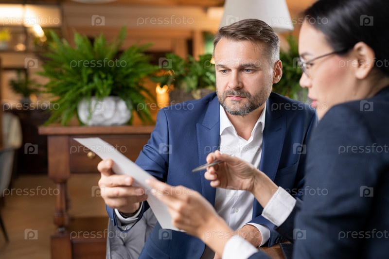 Серьезный бизнесмен просматривает контракт во время обсуждения с коллегой