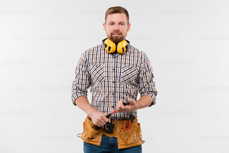 Счастливый молодой бородатый мастер-ремонтник с защитными наушниками, молотком и ремнем инструмента
