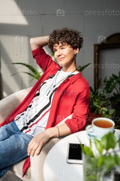 Спокойная и удовлетворенная женщина в стильной повседневной одежде отдыхает в кресле
