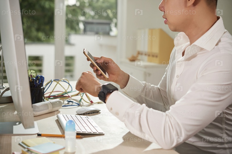 Бизнесмен соединяет умные часы с мобильным телефоном