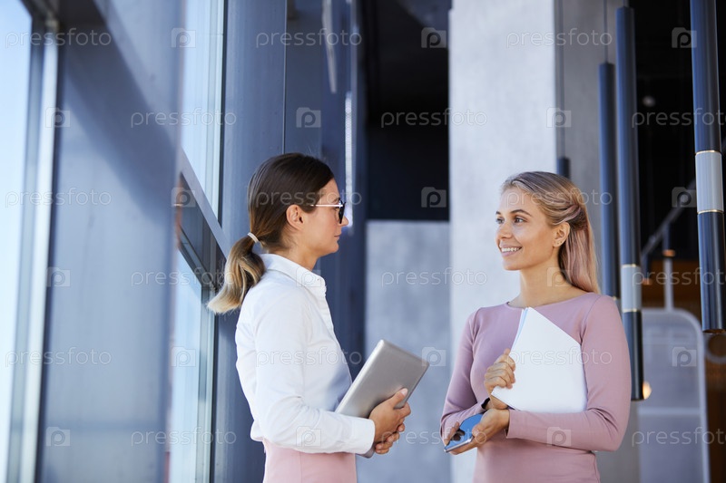 Позитивные привлекательные коллеги-женщины в стильных нарядах стоят у окна в коридоре и говорят о работе